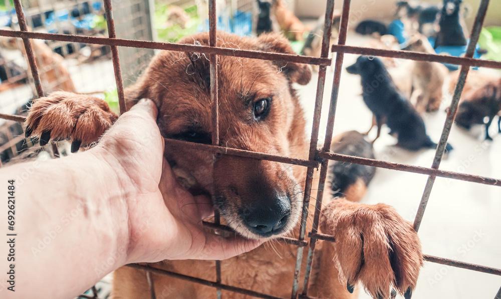 Zwierzęta - Portrait of lonely sad abandoned stray dog behind the fence at animal shelter. Best human's... #692621484