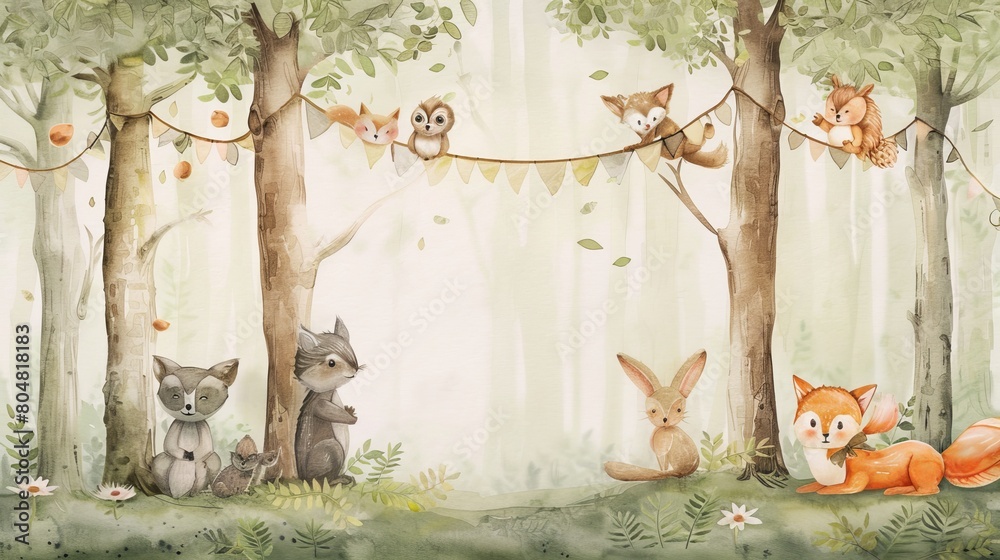 • Watercolor canvas print featuring whimsical woodland creatures with customizable name banners floating amidst the trees