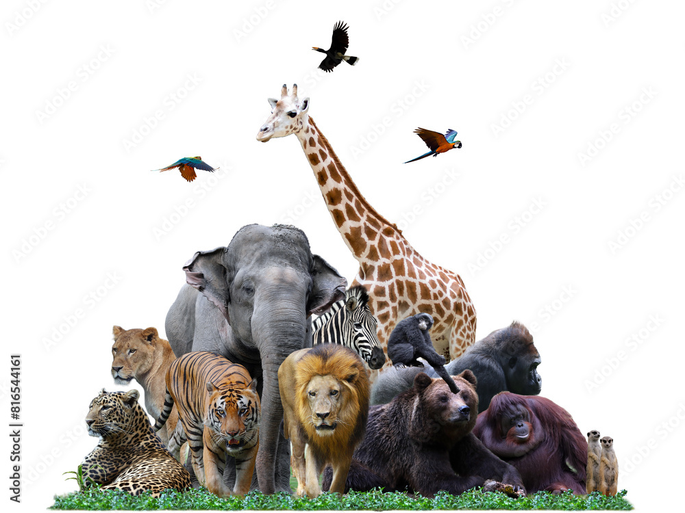 Zwierzęta - Group of safari animals together on white header with room for text on the bottom side, Group of... #816544161