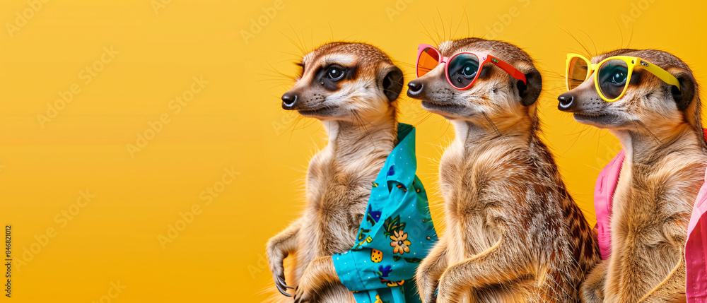 Zwierzęta - Three meerkats wearing sunglasses and shirts stand in a row against a yellow background #846821012