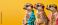 • Three meerkats wearing sunglasses and shirts stand in a row against a yellow background