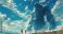 • Two children stand in awe as they face a giant sea creature emerging from the ocean, highlighting a sense of wonder and adventure against a vast sky and shimmering waves.