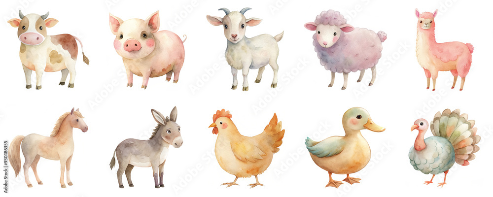 Zwierzęta - Farm animals in watercolor illustration set. Cute icons collection of featuring various domestic... #930486355