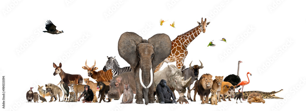 Zwierzęta - Large group of african safari wildlife animals standing together on a white background,... #984333094