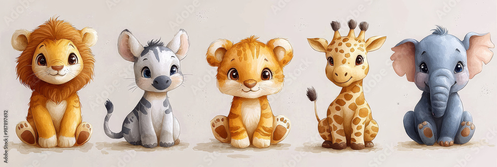Zwierzęta - Five adorable cartoon baby animals sitting together. #987897692