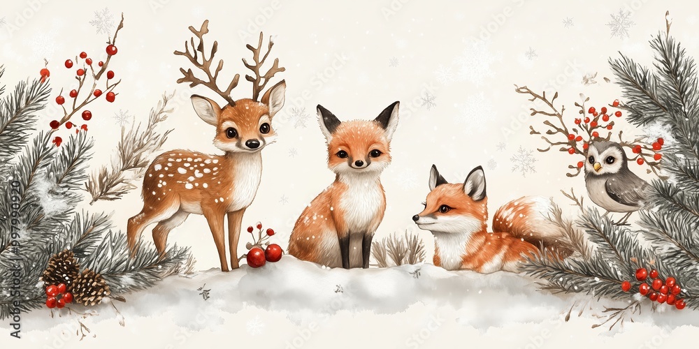 • A charming winter scene featuring woodland animals in a snowy landscape. The illustration includes an adorable fawn and two playful foxes.