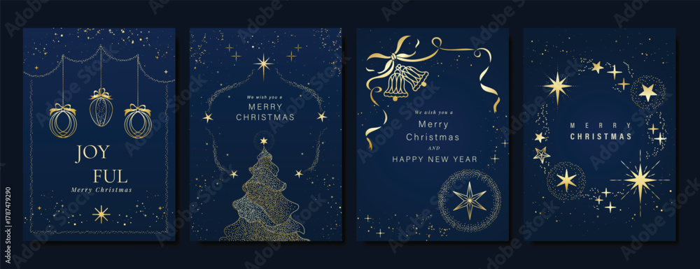 • Christmas Luxury gold invitation card design vector. Christmas pine leaves, snowflake with gold foil and spot texture on navy blue background. Design illustration for cover, print, poster, ads.