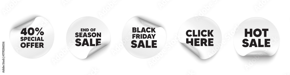 • Discount sticker tag. Season sale, Black friday paper price banners. 40 percent discount offer tag. Sale price promo sign. Special offer symbol. Click here sticker. Vector