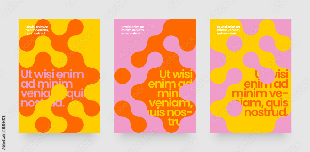 • Template with mosaic circles. Abstract bauhaus geometric pattern backgrounds with metaball fusion. Layout for flyer, poster or cover.