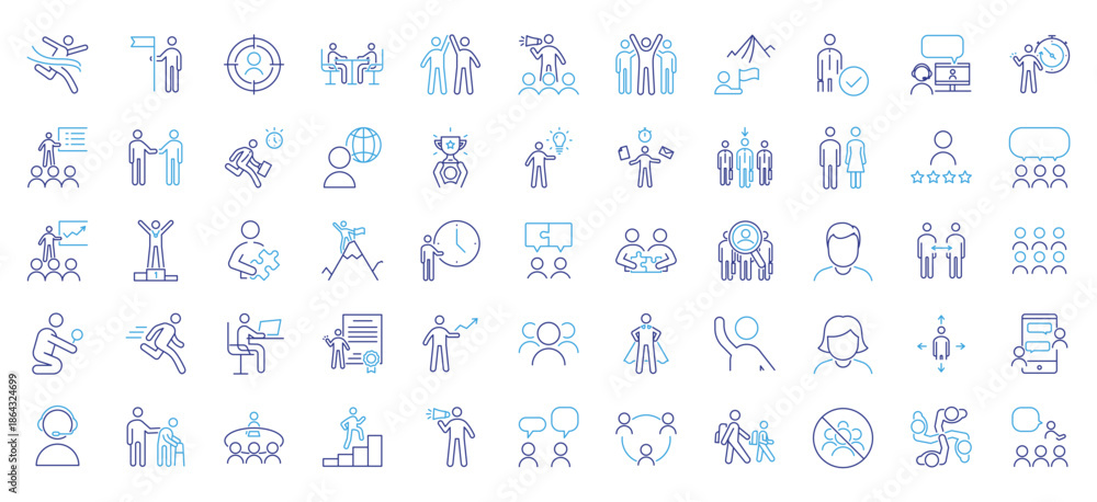 Ludzie - Teamwork, actions, leadership and human interactions icon set. Thin line editable stroke icons... #1864324699