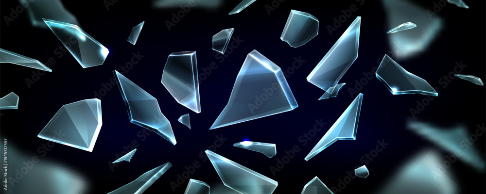 • Shattered glass pieces flying in air, realistic vector background. 3d ice shards and crystal fragments with dynamic broken mirror effect. Window explosion texture on dark backdrop