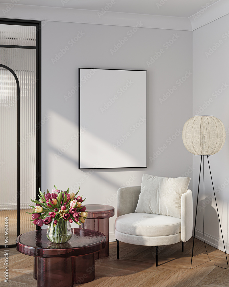 Ludzie - Modern Living Room Poster Frame Mockup with Natural Light and Minimalist Decoration. 3D render. #1951955086