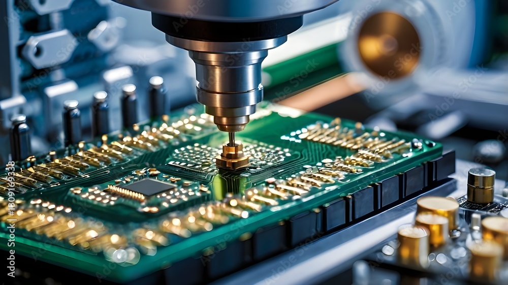 • Close-up of semiconductor manufacturing with precision machinery and microchips, symbolizing advanced technology and electronics production.