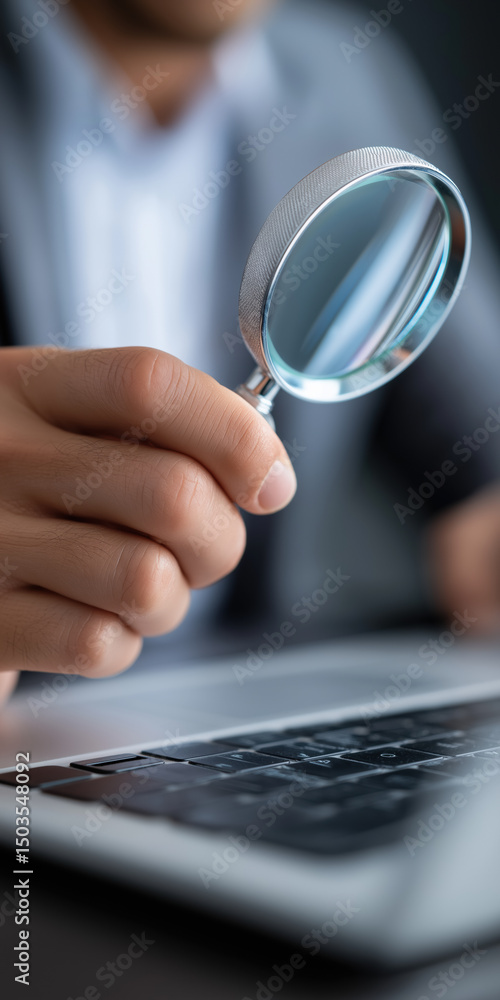 • A man is holding a magnifying glass over a laptop. Concept of curiosity and investigation, as if the man is trying to uncover something hidden or important on the laptop screen