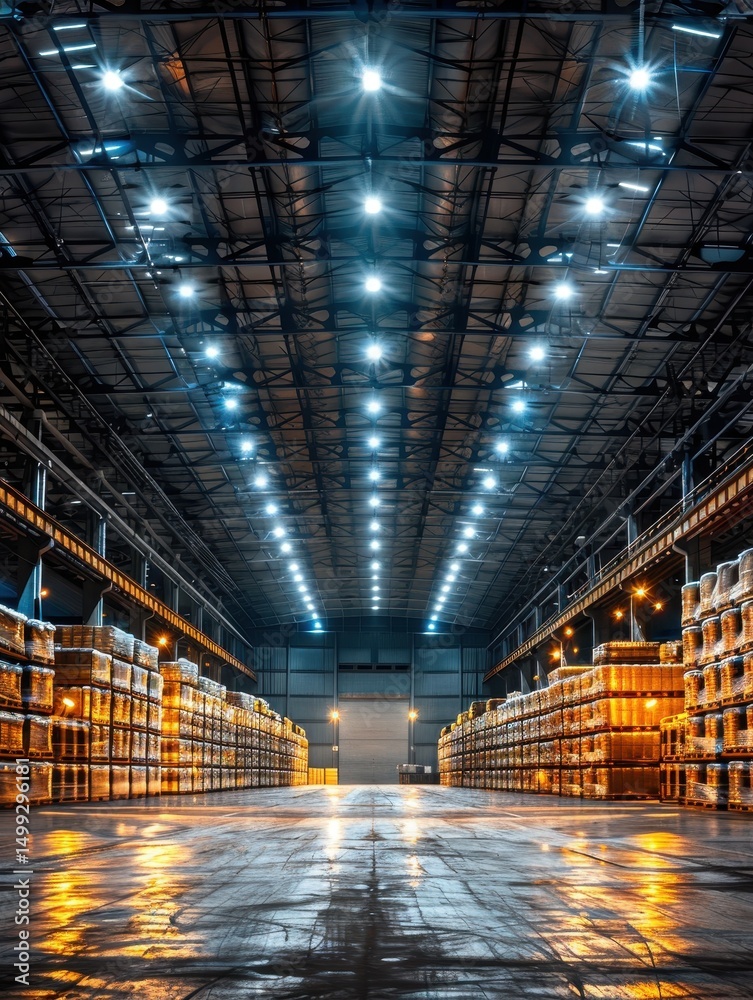 Naklejka Architektura - Przemysłowa architektura wnętrz, oświetlenie LED, hala produkcyjna #1499296181