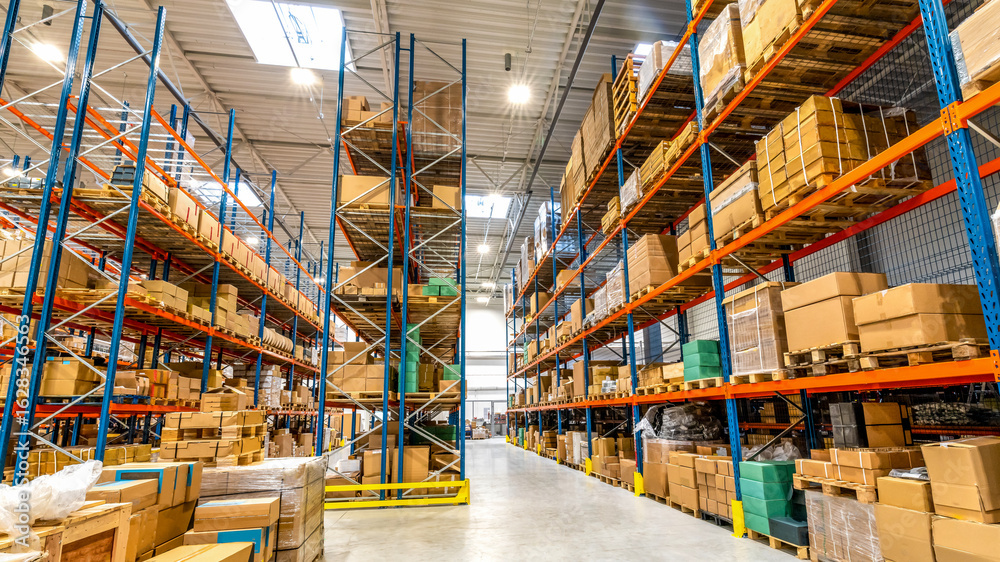 Naklejka Architektura - Magazyn wysokiego składowania. Wiele pólek z kartonami i paletami z towarem na sprzedaż #1628346563