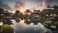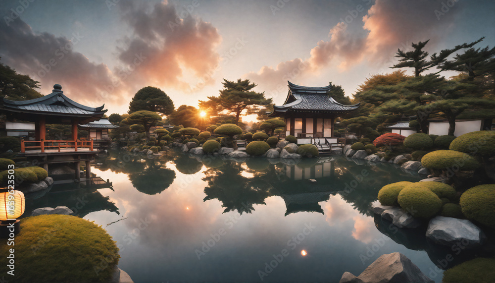 • Grafika 8k. Magiczny ogród zawierający staw, świątynie i wspaniałą roślinność. Park w stylistyce azjatyckiej - szczególnie japońskiej.