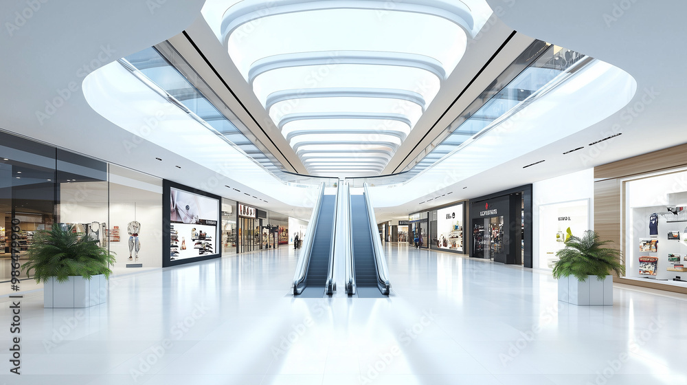 Naklejka Architektura - Nowoczesne centrum handlowe z jasnymi, przestronnymi korytarzami, stylowymi sklepami i... #986479960