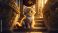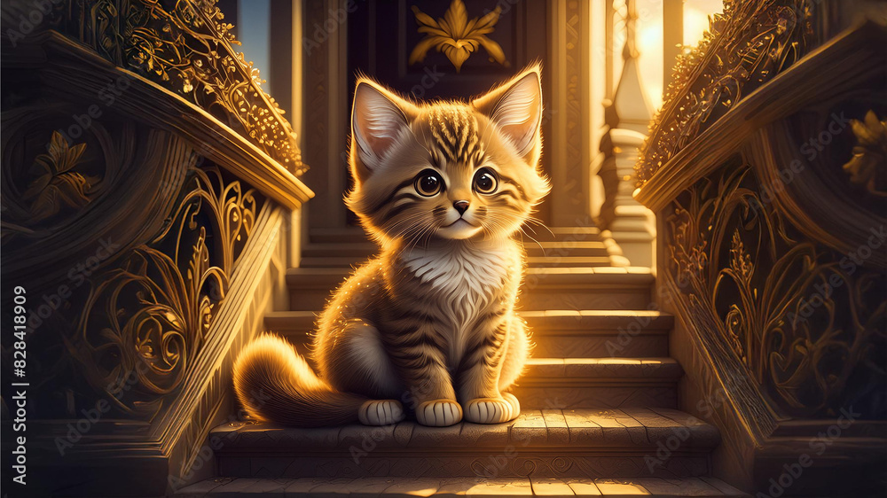 Naklejka Bajki - Mały kot, kotek siedzi na schodach przed wejściem do domu #828418909