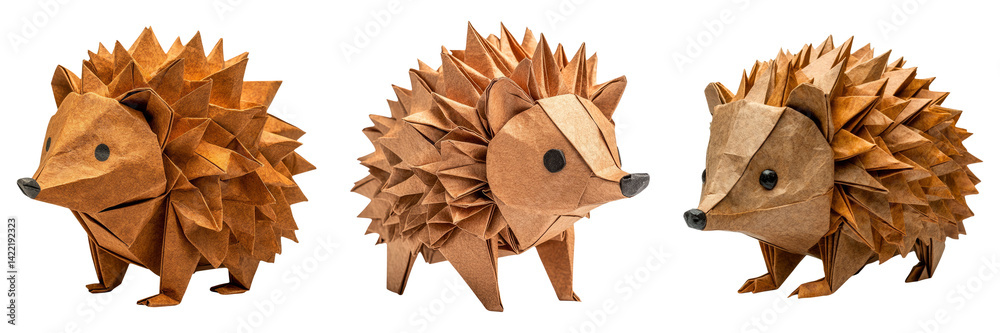 Naklejka Origami - Adorable origami hedgehogs in various poses isolated on transparent PNG image perfect for... #1422192323