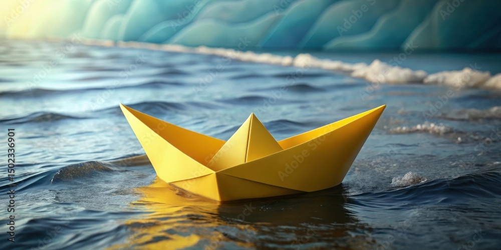 Naklejka Origami - A small, bright yellow origami boat floats serenely on the gentle waves, navigating towards a... #1502336901