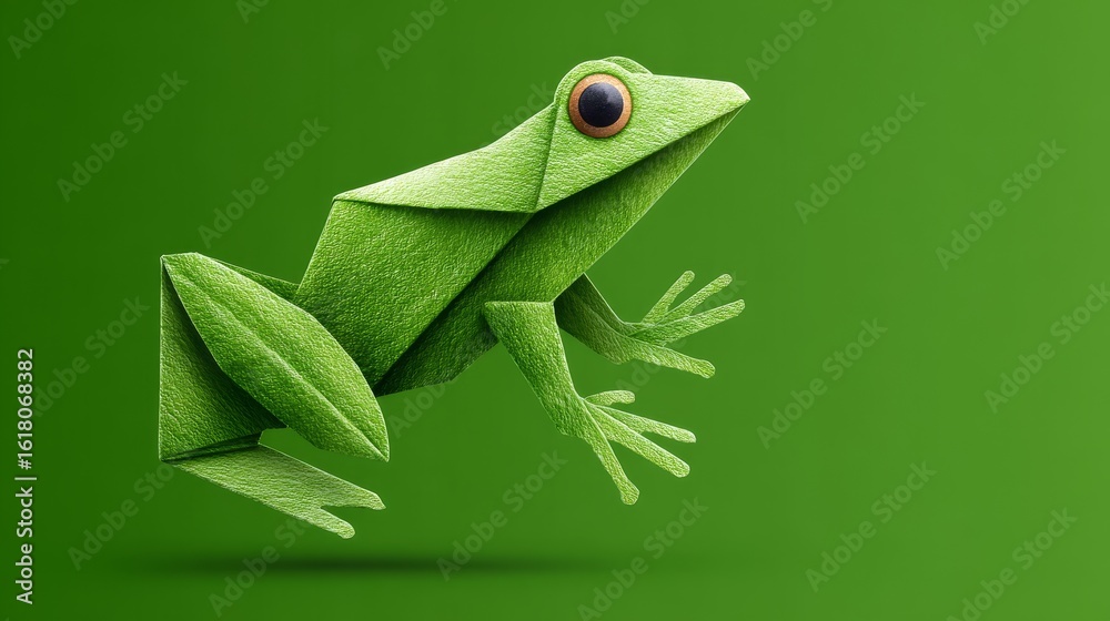 Naklejka Origami - Energetic origami frog leap handmade japanese paper craft artful display in vibrant green nature... #1618068382