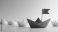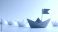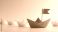 • Red origami boat with flag among white boats light backdrop Thanksgiving card kids craft flat lay