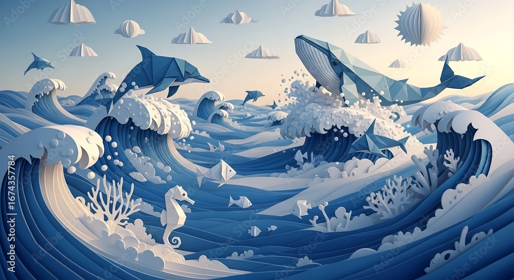 • Playful origami dolphins and whales frolic in dynamic paper ocean waves with marine life