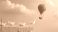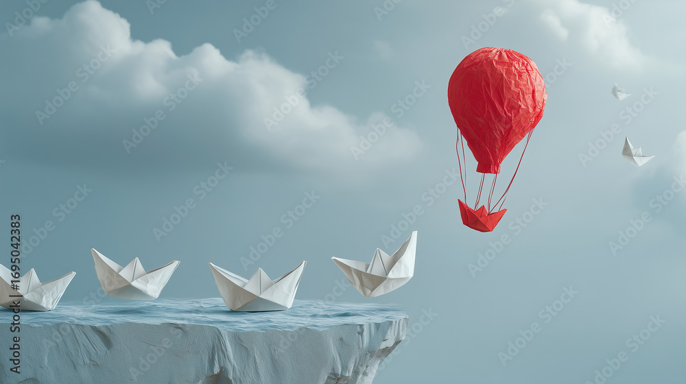 • Red paper hot air balloon flying above paper boats on cliff edge with cloudy sky