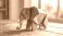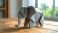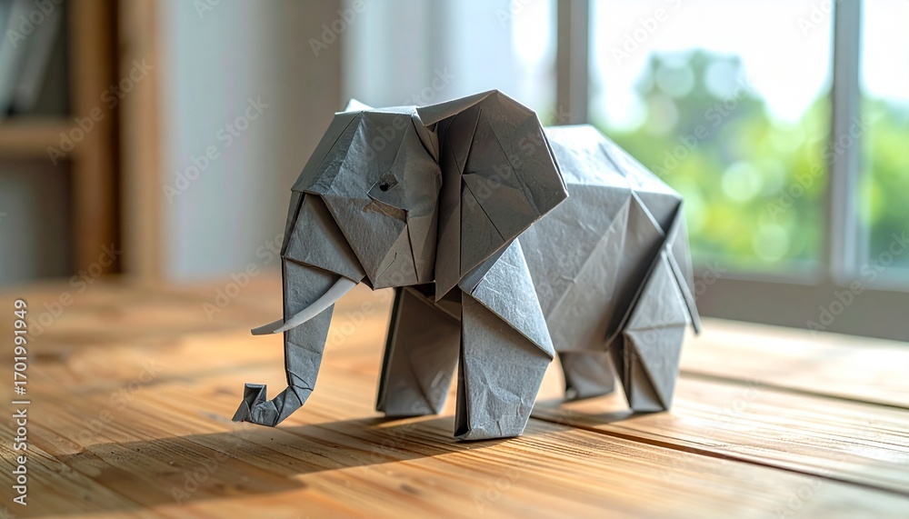 • A beautifully crafted grey origami elephant sitting on a sunlit wooden table