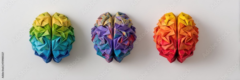 • Three colorful origami brain models, displayed horizontally on a white background.