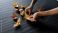 • Hands folding orange and brown origami crane on black surface with multiple cranes
