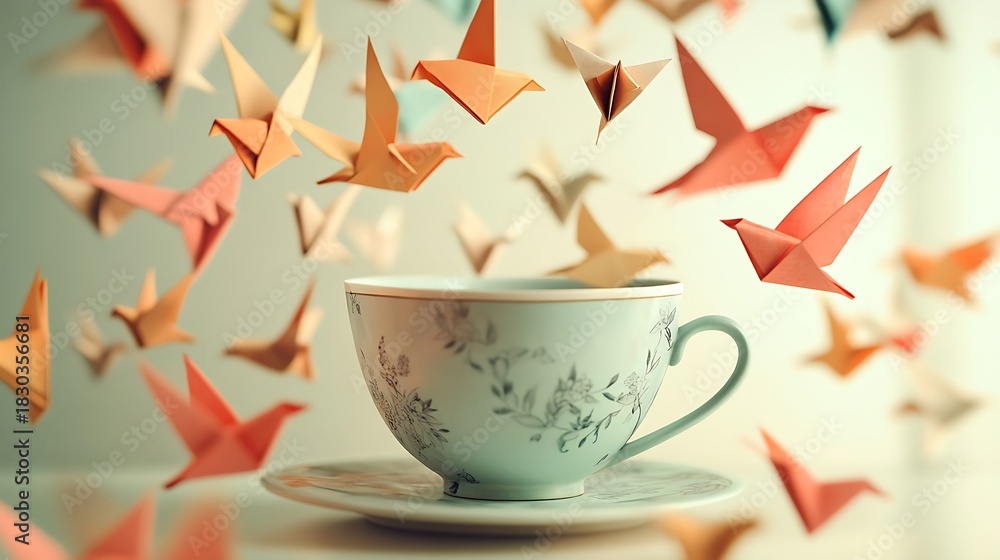 Naklejka Origami - Tea cup surrounded by flying origami birds #1830356681