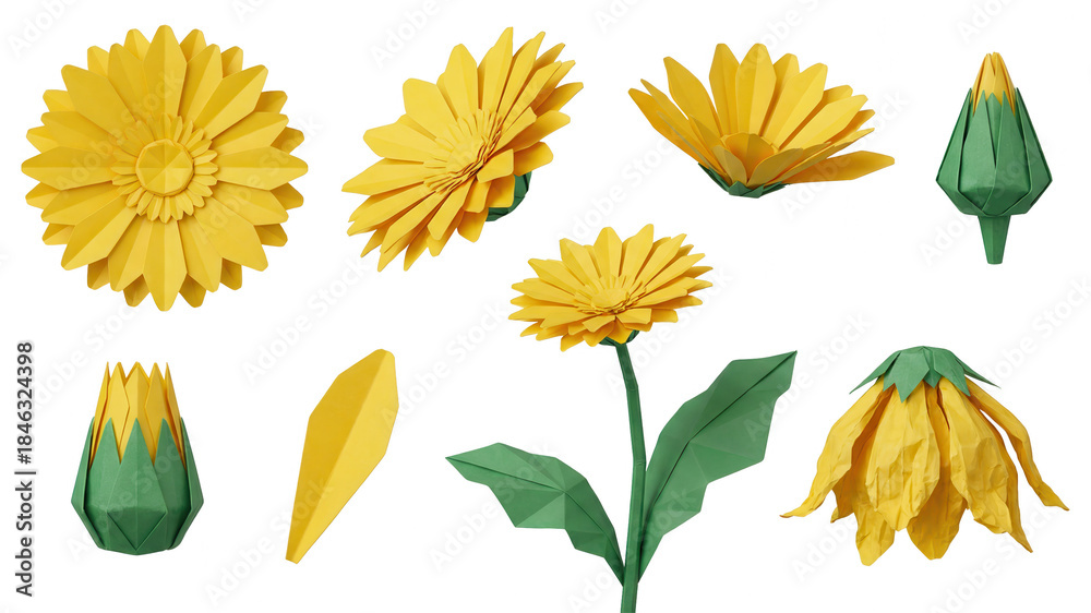 • Origami Yellow Gerbera Daisy Collection: Paper Art on White Background
