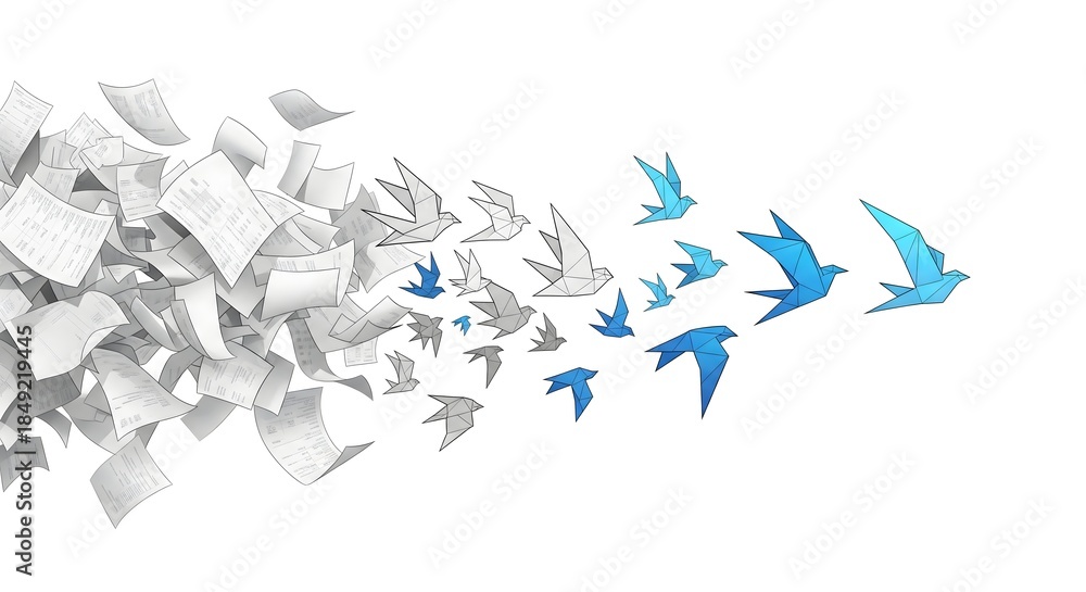 • Digital Transformation Concept: Chaotic Pile of Documents Transforming into Flying Blue and White Origami Birds