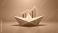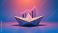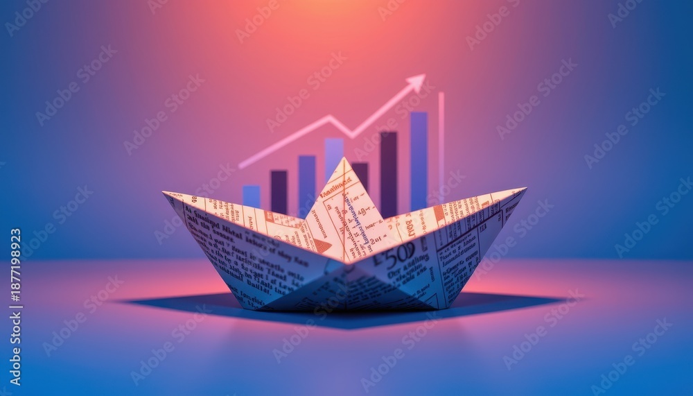 • Paper Boat on Blue Surface with Business Graphs and Charts in Background Symbolizing Growth and Innovation