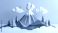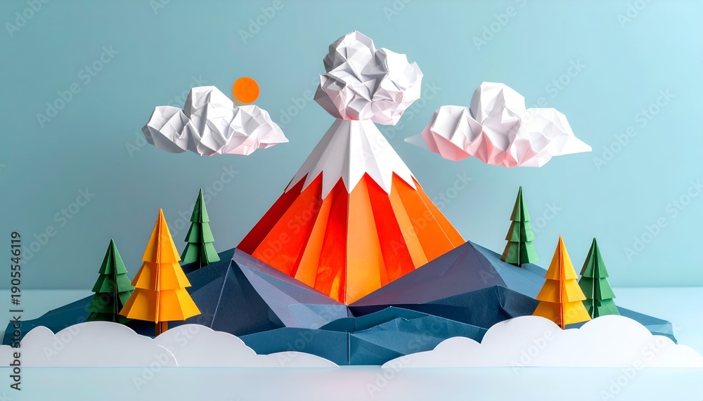 • Paper-crafted volcano erupts against a light blue backdrop with trees, clouds, sun, and mountain in origami style