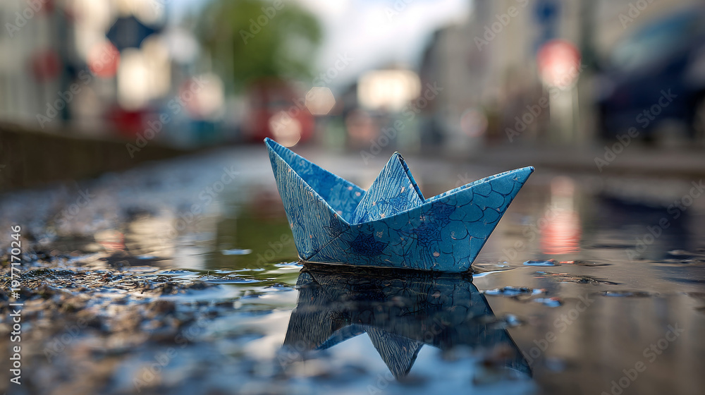 • blue origami paper boat floats in a large puddle on a city street on a sunny spring morning.