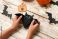 Naklejka Origami - Child making Halloween decorations and origami bat on wooden background #929478812