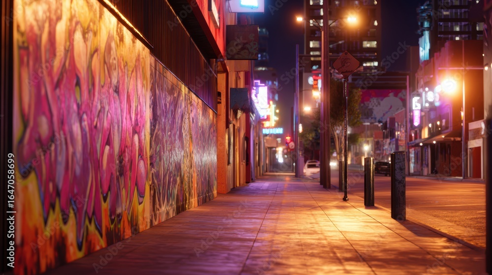 • Vibrant urban street at night with colorful graffiti and illuminated buildings in the background
