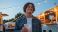 • Smiling young man enjoying beverage at vibrant outdoor food mark