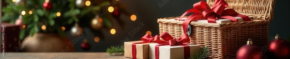 • Oversized wicker hamper, lavish paper-wrapped gifts, festive food , luxury, winter, ribbon