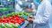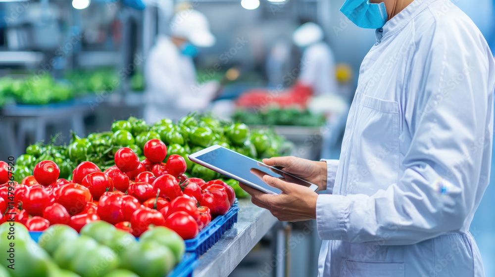 • Worker in food processing facility checks inventory on tablet while surrounded by fresh vegetables, showcasing modern agricultural environment