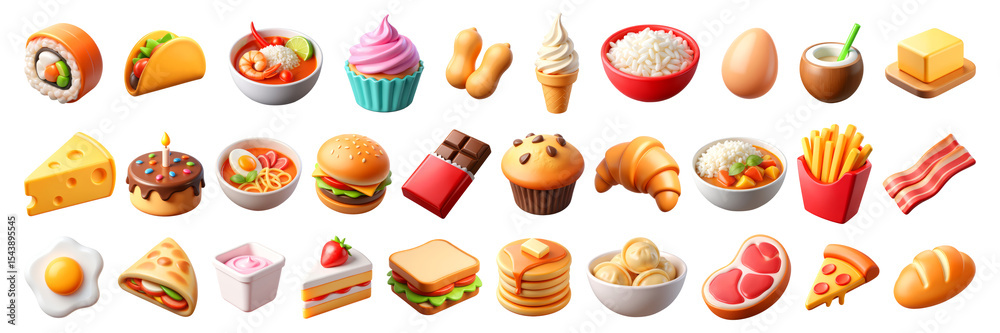 • Large Big Set of 3D Food Icons – Glossy Minimal Emoji Style, Isolated PNG objects