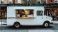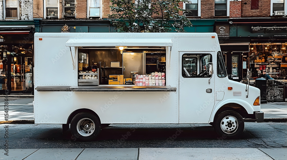 Naklejka Jedzenie - White food truck on city street mobile food vendor service #1545784642