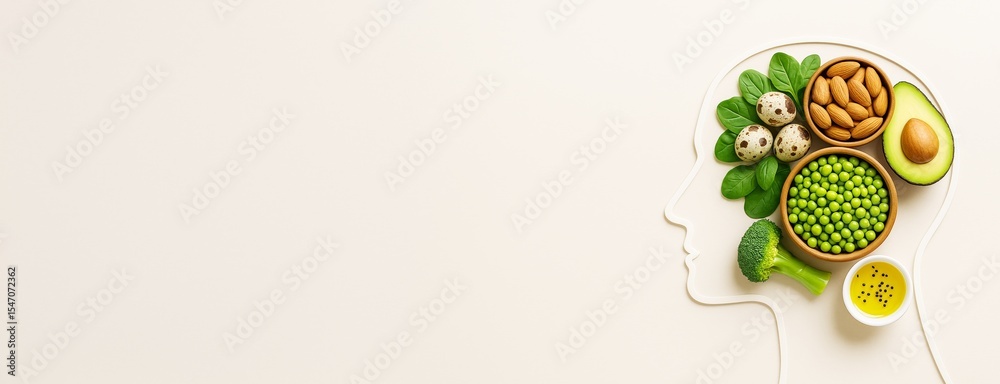• Brain-shaped food arrangement with healthy green vegetables, nuts, and eggs on light background for health and nutrition promotion concept.