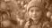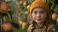 • Young girl in yellow knit hat stands in an apple orchard with ripe fruits