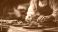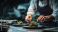• Professional chef preparing gourmet dish at elegant restaurant kitchen counter, plating food with herbs and sauce, dark moody background, empty area