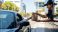 • Drive-through service: a smiling male employee in a cap hands a paper bag with food to a customer in a dark car at a fast food restaurant or cafe.