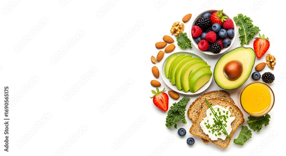 • Healthy Breakfast Foods Arrangement on White Background Top View